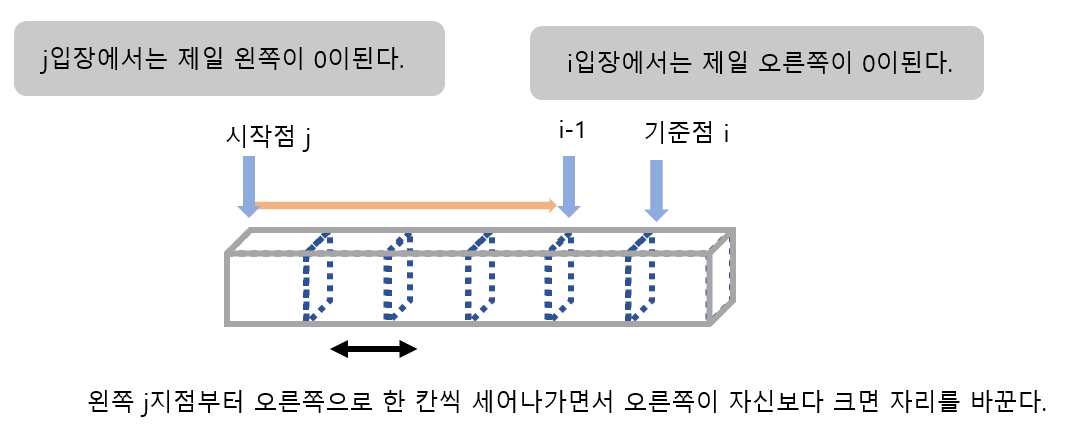 즉, 오른쪽 기준점에 가장 큰 수 i를 두겠다는 목표를 두고 j가 0부터 i가 있는 지점(i-1)까지 하나하나씩 바로 오른쪽에 숫자와 비교를 하여 큰 수를 오른쪽에 두면 됩니다. 그렇게 하면 결국 j가 0에서 i-1이 되었을 때에는 i번째와 비교하면서 i번째까지 중에 가장 큰 수를 오른쪽에 둘 수 있게 됩니다.